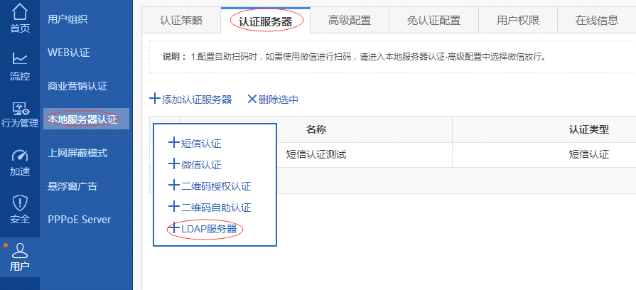 进入“用户”--->“本地服务器认证”--->“认证服务器”, 选择“添加认证服务器”