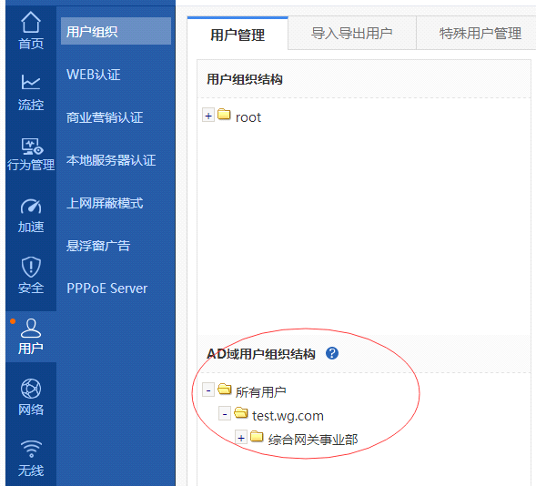 点击“用户同步”,将把搜索路径下的AD域组织架构下载到本地,通过“用户”--->“用户组织”页面进行查看