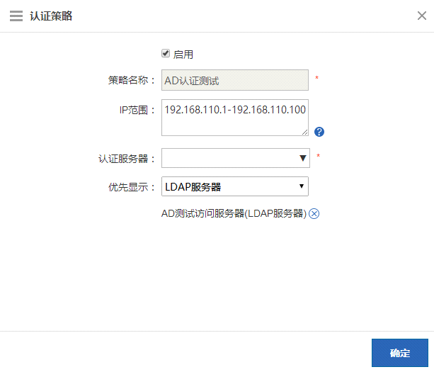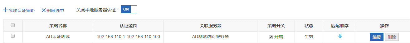 4.     认证服务器项勾选需要匹配的认证方法,本例选择“AD测试访问服务器”。